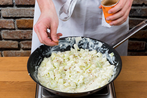 In einem mittelgroßen Topf ausreichend Wasser für den Kohlrabi bzw. die Kartoffeln zum Kochen bringen. Den Kohlrabi schälen und in ca. 1cm große Würfel schneiden. Die Kartoffeln schälen und je nach Größe halbieren oder vierteln. Die Zwiebel schälen, halbieren und in sehr feine Würfel schneiden.