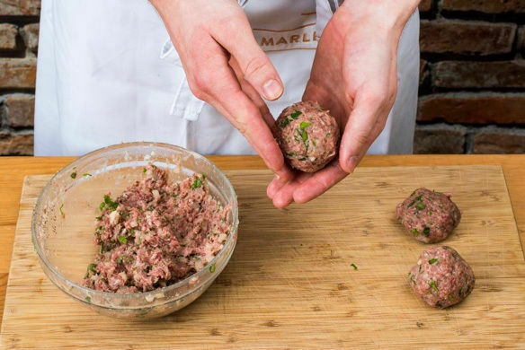 Das Hackfleisch mit den Zwiebeln, den Semmelbröseln, der Petersilie, 1,5EL körnigem Senf sowie Salz, Pfeffer und 1 Prise Muskat vermengen, zuletzt 1 Ei untermischen. Tipp: Wer mag, kann etwas Petersilie zum Garnieren beiseitelegen. Die Hackfleischmasse in ca. 8 gleich große Kugeln portionieren und diese zu Bouletten formen.