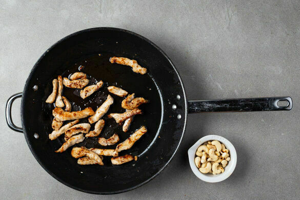 Die Cashews grob hacken und in einer großen Pfanne ohne Zugabe von Fett bei mittlerer bis starker Hitze 2–3Min. goldbraun anrösten. Vorsicht, sie können schnell verbrennen. Aus der Pfanne nehmen und beiseitestellen. Das Fleisch in derselben Pfanne mit 2EL Pflanzenöl bei starker Hitze 3–4Min. anbraten. Auf einem Teller abgedeckt warm halten.
