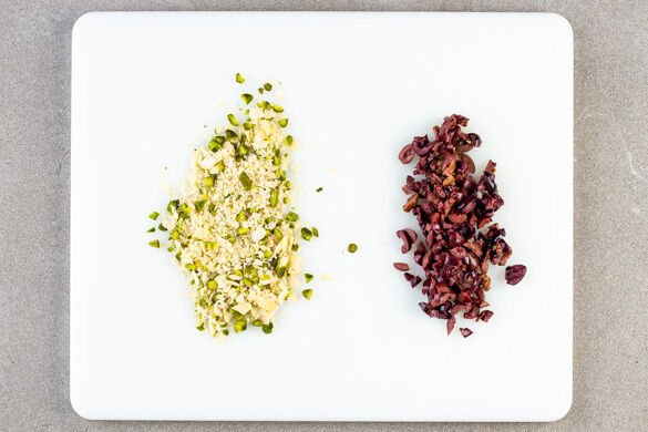 Inzwischen die Oliven, die Mandeln und die Pistazien fein hacken.
