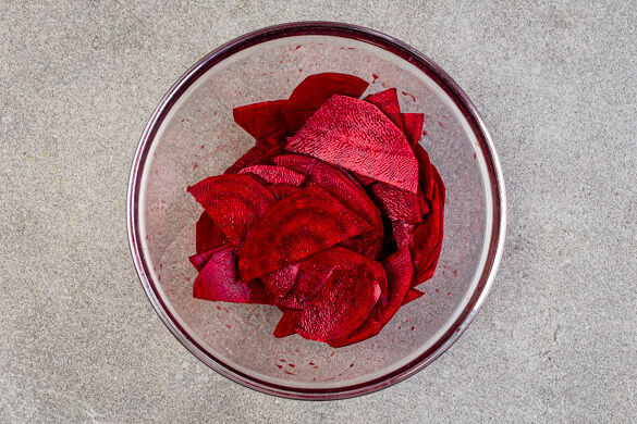 Den Backofen auf 250°C (230°C Umluft) vorheizen. Die Rote Bete schälen, halbieren und mit dem Sparschäler oder einem Messer in hauchdünne Scheiben schneiden. Tipp: Da Rote Bete stark färbt, beim Verarbeiten am besten Küchenhandschuhe und Schürze tragen. 1EL Essig, 1 kräftige Prise Salz und 1 Prise Zucker verrühren und mit der Roten Bete vermengen.