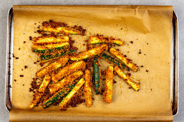 Das Bratkartoffelgewürz mit 2EL Mehl, 1EL Olivenöl, 2EL Wasser und 1 kräftigen Prise Salz verrühren. Die Zucchini in 5–7cm lange, pommesartige Stifte schneiden und mit der Mehl-Mischung vermengen. Anschließend das Paniermehl untermengen, bis die Zucchini rundum bedeckt sind.