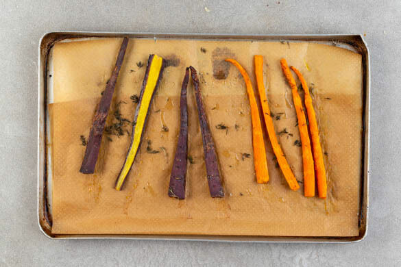 Die Karotten im vorgeheizten Ofen in 20–25Min. goldbraun backen, dabei zur Hälfte der Zeit einmal wenden.