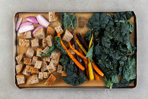 Die Schalotten, den Grünkohl und die Brötchenwürfel auf einem weiteren mit Backpapier ausgelegten Backblech mit 1EL Olivenöl und 1 kräftigen Prise Salz vermengen und für die letzten 10–15Min. Garzeit der Karotten im Ofen mitbacken, bis die Brötchenwürfel goldbraun und knusprig sind.