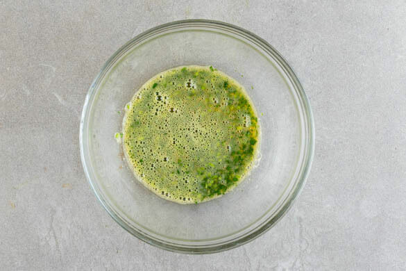 Den restlichen Koriander samt Stängeln fein schneiden, dann mit den Eiern und 1 kräftigen Prise Salz verquirlen. Die Tortillas in die Ei-Mischung tauchen und darauf achten, dass beide Seiten jeweils vollständig bedeckt sind.