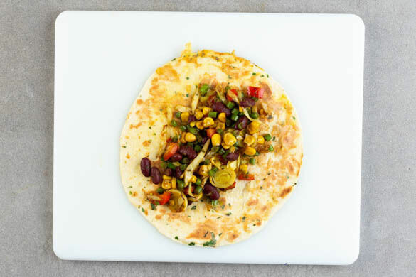 1 Tortilla in der Pfanne mit 1TL Pflanzenöl bei mittlerer bis starker Hitze 10–20Sek. auf jeder Seite anbraten und anschließend auf einem Teller beiseitestellen. Den Vorgang mit weiteren 7 Tortillas wiederholen.
