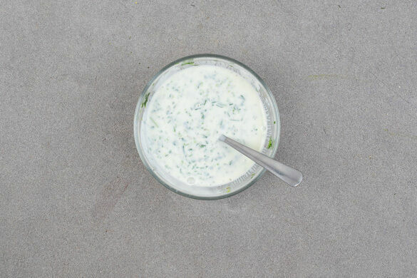 Die Petersilie samt Stängeln und den Schnittlauch fein schneiden. Die ½ des Knoblauchs oder mehr nach Geschmack schälen und fein würfeln oder reiben. Den Joghurt mit den Kräutern, dem Knoblauch, 1–2EL Wasser sowie je 1 kräftigen Prise Salz und Pfeffer verrühren. Ggf. etwas mehr Wasser hinzufügen, falls die Sauce zu dickflüssig ist.