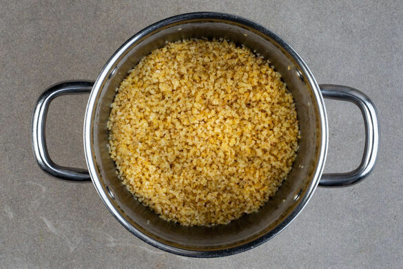 In einem mittelgroßen Topf 600ml leicht gesalzenes Wasser zum Kochen bringen. Den Bulgur in das kochende Wasser rühren und abgedeckt bei niedriger Hitze 8–10Min. sanft köcheln lassen, bis das Wasser aufgesaugt und der Bulgur gar ist. Noch ca. 5Min. ohne Hitzezufuhr ziehen lassen.