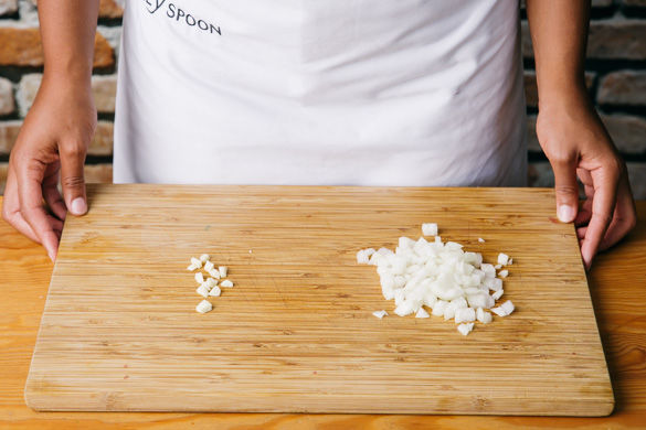 In einem mittleren Topf ausreichend gesalzenes Wasser für die Pasta aufsetzen. Die Zwiebel und den Knoblauch schälen und beides in grobe Würfel schneiden.