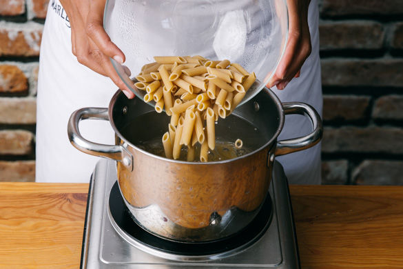 Sobald das Wasser kocht, die Pasta in leicht gesalzenem Wasser ca. 11-13Min. bissfest abkochen. Ca. 100ml Pastawasser abschöpfen, den Rest abgießen und die Pasta kalt abschrecken.