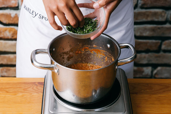 Inzwischen die Kirschtomaten vierteln. Den Rucola fein schneiden. Den Rosmarin und Thymian vom Stängel streifen und fein schneiden.