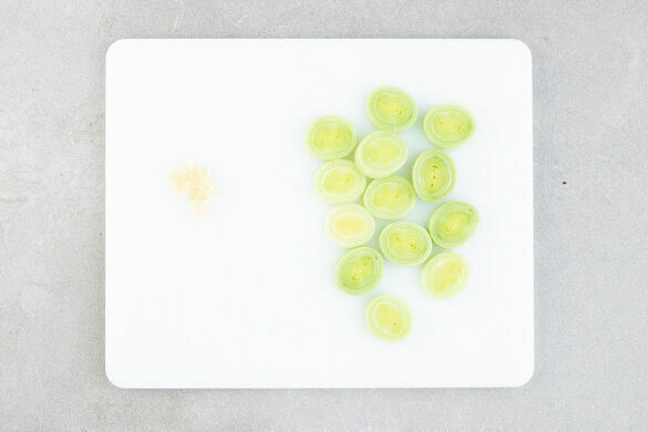 In einem großen Topf ausreichend leicht gesalzenes Wasser für die Pasta zum Kochen bringen. Den Lauch in dünne Scheiben schneiden. Den Knoblauch schälen und fein würfeln.