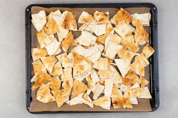 Das Fladenbrot in mundgerechte Stücke zupfen, auf zwei mit Backpapier ausgelegten Backblechen mit jeweils 1EL Olivenöl sowie je 1 kräftigen Prise Salz und Pfeffer vermengen und gleichmäßig verteilen. Im Ofen 8–12Min. backen, bis die Brotchips knusprig sind. Nach der Hälfte der Zeit die Position der Bleche tauschen.
