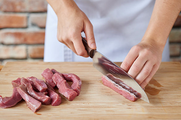 Das Fleisch trocken tupfen und in fingerdicke Streifen schneiden.