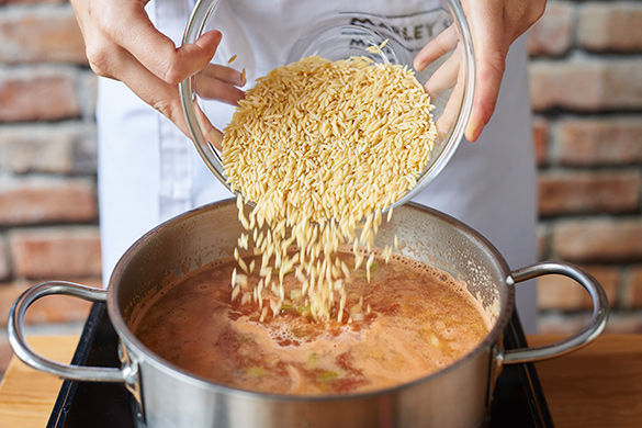 Der Eintopf ist ein deutsches Traditionsgericht. Diese Variante bringt jedoch frischen Wind, denn der Tomaten-Sud wird mit feinem Gemüse und italienischen Risoni-Nudeln aufgepeppt. Als Einlage gibt es zartes Rindfleisch und einen Klecks Crème fraîche.