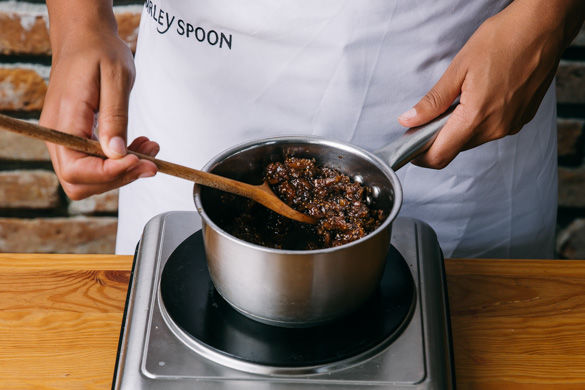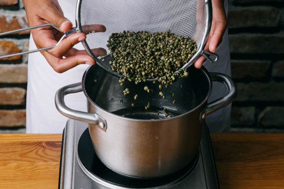 400ml im mittleren Topf zum Kochen bringen. Die Linsen in einem Sieb unter fließendem Wasser abspülen, bis das Wasser klar bleibt und dann in das kochende Wasser geben. Auf niedriger Hitze für ca. 25-30Min. köcheln lassen, ggfs. überschüssiges Linsenwasser abgießen und abkühlen lassen. Den Umluftofen auf 200°C vorheizen.