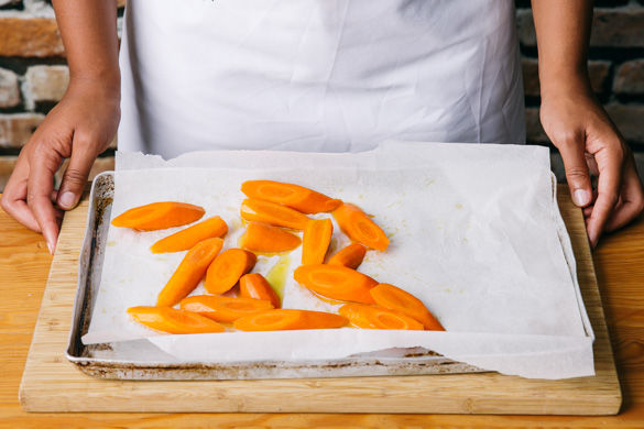 Inzwischen die Karotten schälen, trimmen und in ca. 2-3cm schräge Scheiben schneiden, anschließend auf ein mit Backpapier ausgelegtem Blech verteilen, etwas Platz für den Käse lassen. Die Karotten mit 1TL Salz und 1EL Olivenöl mischen und für ca. 8-10Min. im Ofen rösten.