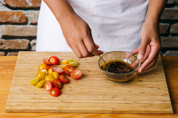Die Kirschtomaten halbieren. Den restlichen Balsamico-Essig mit Senf, 1-2El Olivenöl, Salz und Pfeffer zu einem Dressing mischen.