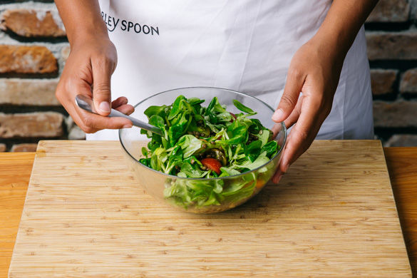 Den Salat erst kurz vor dem Servieren mit abgekühlten Linsen, Tomaten, Karotten und Dressing mischen. Den Käse mit dem Feigenchutney garniert servieren und Salat dazu reichen.