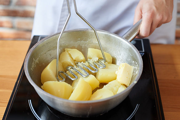 Sobald die Kartoffeln weich sind, das Wasser abgießen und die Kartoffeln mit Butter zu einem Püree stampfen. Mit Salz und Pfeffer abschmecken.