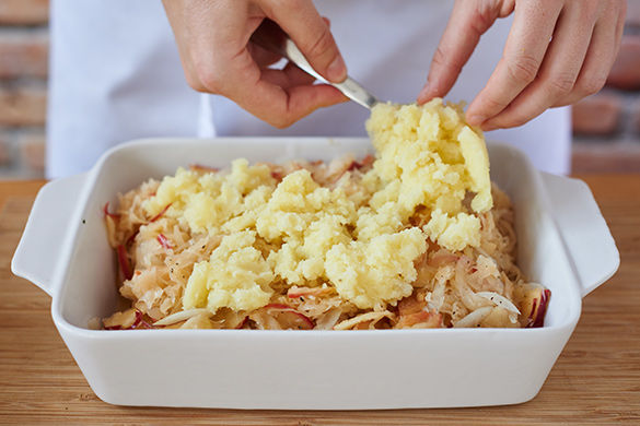 Es gibt Kassler mit Sauerkraut und Kartoffeln. Aber nicht wie gewohnt, sondern geschichtet in einem Auflauf und überbacken mit einer Kruste aus Kartoffelbrei. Als kleines Special haben wir Apfel gebraten und unter den Klassiker gemischt. Das ist mehr als lecker!