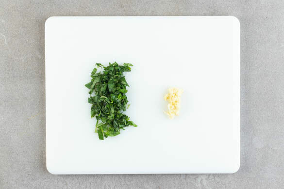 Den Knoblauch schälen und durch eine Knoblauchpresse drücken. Das Basilikum von den Stängeln zupfen und grob schneiden.