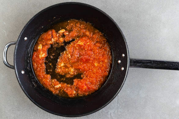 Die Tomate und den Knoblauch in einer mittelgroßen Pfanne mit 2EL Olivenöl, ½TL Salz und 1 kräftigen Prise Pfeffer bei niedriger Hitze ca. 7Min. sanft köcheln lassen.