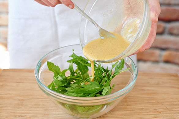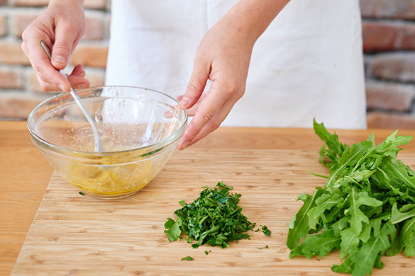 Inzwischen Petersilie fein hacken. Für das Dressing 2EL ÖL, 1EL Essig sowie Salz und Pfeffer in einer Schüssel vermengen.