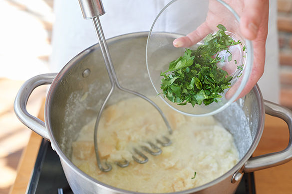 Sobald Kartoffeln und Sellerie gar sind, Wasser abgießen, aber auffangen. Gemüse zurück in den Topf geben, mit einem Kartoffelstampfer zu einem Püree stampfen. Evtl. etwas Kochwasser zugeben, um es cremiger zu machen. Mit Salz, Pfeffer und Petersilie abschmecken.