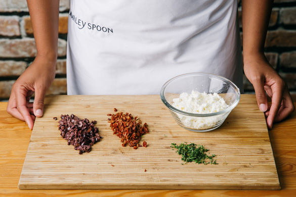 Den Backofen auf 220°C Ober-/Unterhitze vorheizen. Die Oliven und Tomaten abtropfen lassen und fein hacken. Den Thymian von Stängel streifen. Den Käse fein krümeln.