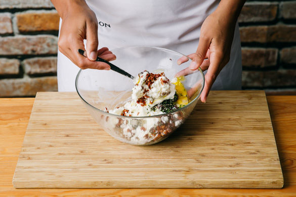 Den gekrümelten Käse mit Crème fraîche, Oliven, Tomaten, Thymian, Salz, Pfeffer und 2 Eiern zu einer Creme mischen.