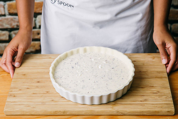 Den Quicheteig mit Papier in eine runde, ca. 28cm breite Tarteform ausrollen und die Füllung hinzufügen. Ggfs. den Teig am Rand einrollen. Tipp: Eine dünne Metallform eignet sich am besten für einen knusprigen Teig! Ca. 25-30Min. im Ofen backen, bis die Füllung goldbraun ist. Im Anschluss ca. 5Min. abkühlen lassen, damit die Füllung etwas aushärtet.