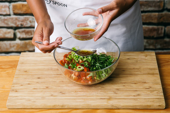 Zum Schluss Tomatenwürfel mit Lauchzwiebeln, 1-2EL Olivenöl, 1-2EL Essig, Salz und Pfeffer zu einer Salsa mischen.