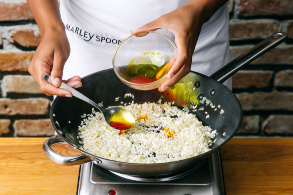 Die Zwiebelwürfel in einer großen Pfanne mit 1–2EL Olivenöl auf mittlerer Hitze ca. 1–2Min. glasig anschwitzen. Den Reis hinzufügen und leicht anbraten, mit Verjus und Safranwasser ablöschen und weitere ca. 1–2Min. braten.