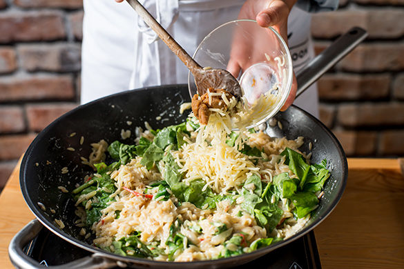 Pfanne mit 2EL Öl auf mittlere Stufe erhitzen. Zwiebel, Knoblauch, Pak Choi Stiele ca. 3-5min. weich braten. Milch, 400ml Wasser und Risoni Nudeln zugeben, mit Salz würzen, ca. 8-12Min. unter gelegentlichem Rühren bissfest garen. Evtl. mehr Wasser zufügen.