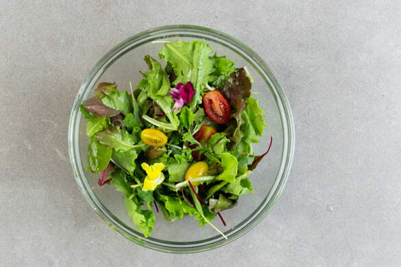 2EL Olivenöl, 1EL hellen Essig, 1TL Honig, 1TL Senf sowie je 1 kräftige Prise Salz und Pfeffer verrühren. Die übrigen Kirschtomaten halbieren und vorsichtig mit dem Babysalat, den Blüten und dem Dressing vermengen.