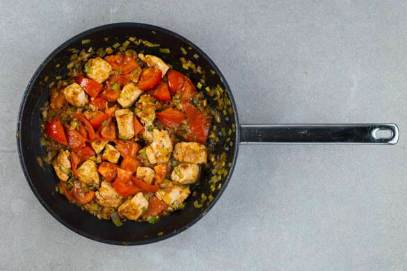 Die Tomaten grob würfeln, zum Fleisch und Lauch in die Pfanne geben und alles abgedeckt 7–9Min. köcheln lassen, bis das Fleisch gar ist. Mit Salz und Pfeffer abschmecken.