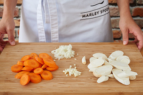 Ofen auf 180°C Ober-/Unterhitze vorheizen. Karotten und Pastinaken schälen und in ca. 0,5cm dünne Scheiben schneiden. Zwiebel und Knoblauch schälen und in feine Würfel schneiden.