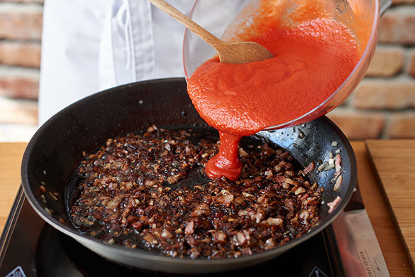 Große Pfanne mit 1EL Öl auf mittlere Stufe erhitzen. Speck knusprig braten. Zwiebeln und Knoblauch zugeben und ca. 2Min. braten. Hälfte des Tomatenmarks zugeben und kurz mitbraten. Das restliche Tomatenmark wird nicht verwendet.