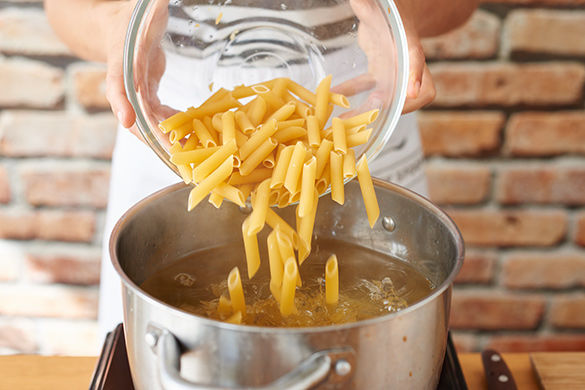 Sobald das Wasser kocht, Pasta ca. 11Min. bissfest kochen. Ca. eine halbe Tasse des Kochwassers auffangen, anschließend Wasser abgießen und Pasta abtropfen lassen. Basilikumblätter grob hacken.