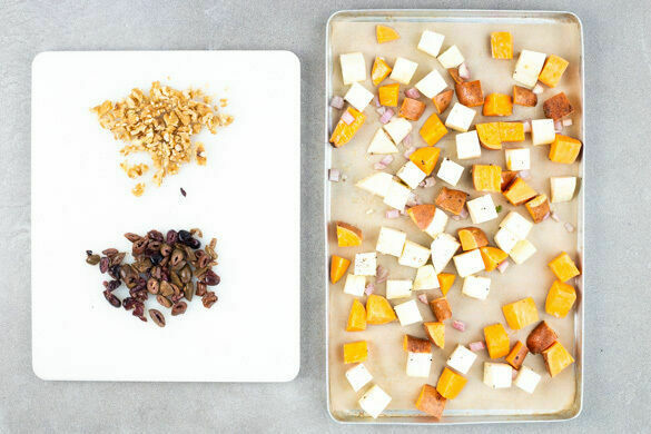 Den Backofen auf 240°C (220°C Umluft) vorheizen. Die Cranberrys mit 100ml heißem Wasser in ein hohes Gefäß geben und beiseitestellen. Die Schalotte schälen und grob würfeln. Die Süßkartoffeln schälen und in 1–2cm große Würfel schneiden. Den Sellerie vierteln, ebenfalls schälen und in 1–2cm große Würfel schneiden.