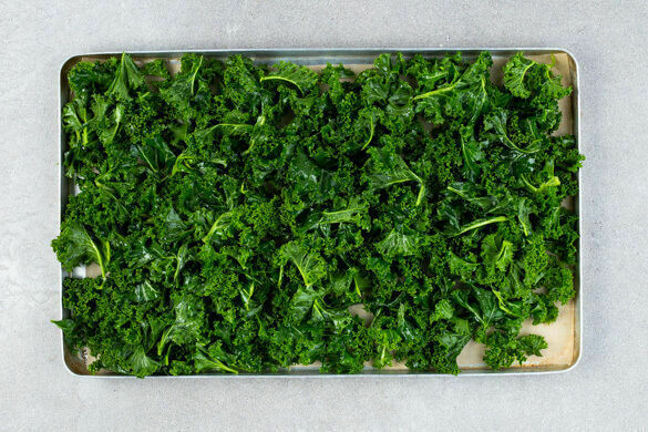 Den Backofen auf 190°C (170°C Umluft) zurückschalten. Die Grünkohlblätter vom Strunk befreien und in dünne Streifen schneiden, dann mit ½TL Salz 1–2Min. kneten, bis der Grünkohl weich wird. Den Grünkohl auf einem zweiten mit Backpapier ausgelegten Backblech verteilen und 8–10Min. im Ofen backen, bis die Ränder knusprig und goldbraun sind (siehe Kochtipp).