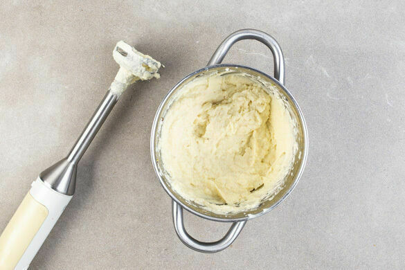 Den Backofen auf 240°C (220°C Umluft) vorheizen. Den Knollensellerie schälen und jeweils in 1–2cm große Stücke schneiden. In einem großen Topf mit gesalzenem Wasser bedecken, zum Kochen bringen und in ca. 10Min. weich kochen.