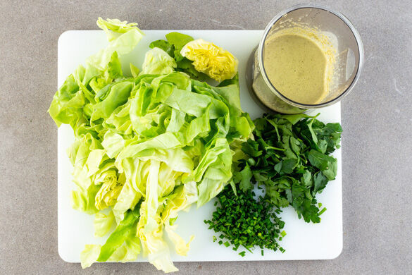 Den Salat in Streifen schneiden. Die Petersilie ohne harte Stängel grob hacken, den Schnittlauch in feine Ringe schneiden. Die Kapern mit 2EL körnigem Senf, 2EL Mayonnaise, 1EL Olivenöl, 1EL Essig, 1EL Wasser und 1 Prise Pfeffer in einem hohen Gefäß mit einem Stabmixer fein pürieren. Mit Salz abschmecken, dann den Salat mit dem Dressing vermengen.
