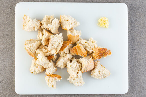 Den Backofen auf 220°C (200°C Umluft) vorheizen. Das Brot in grobe Stücke zerteilen. Den Knoblauch schälen und grob würfeln.