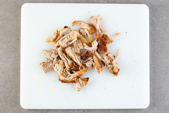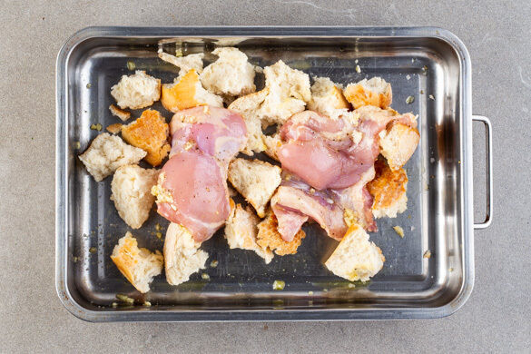 Das Fleisch und die Croûtons aus dem Ofen nehmen, die Croûtons beiseitestellen. Den Ofen auf Grillfunktion umstellen oder auf 240°C Ober-/Unterhitze und das Fleisch 5–10Min. grillen, bis es knusprig ist. Nach der Hälfte der Zeit wenden.