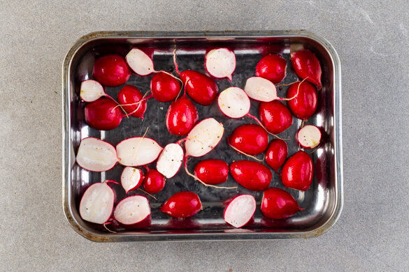 Die Radieschen halbieren und in einer weiteren Auflaufform mit 1EL Olivenöl, 1 kräftigen Prise Salz und 1 Prise Pfeffer vermengen. Im Ofen ca. 5Min. rösten.
