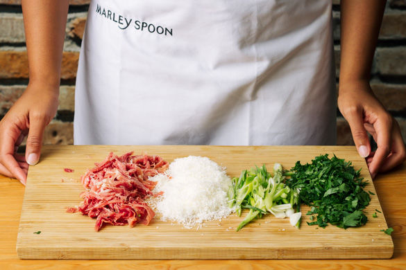 Die Lauchzwiebeln in schräge Scheiben schneiden. Den Käse mit einer Küchenreibe fein reiben. Den Schinken in feine Streifen schneiden. Die Petersilie mit Stängel grob hacken.