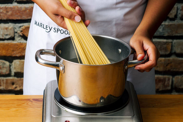 Sobald das Wasser kocht, die Pasta ca. 9-10Min. bissfest kochen. Ca. 100ml Pastawasser abschöpfen, die Nudeln durch ein Sieb abgießen und kalt abschrecken.