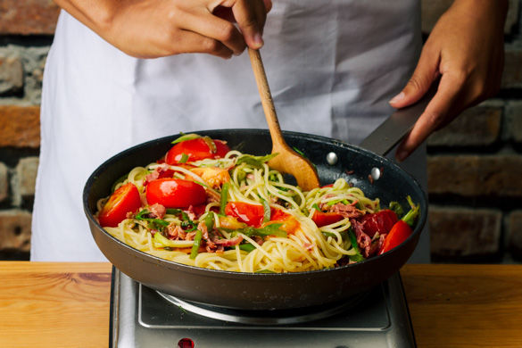 In einen mittleren Topf ausreichend gesalzenes Wasser für die Nudeln zum Kochen bringen. Die Paprika vierteln, vom Kerngehäuse befreien und in feine Streifen schneiden. Die Tomaten achteln.